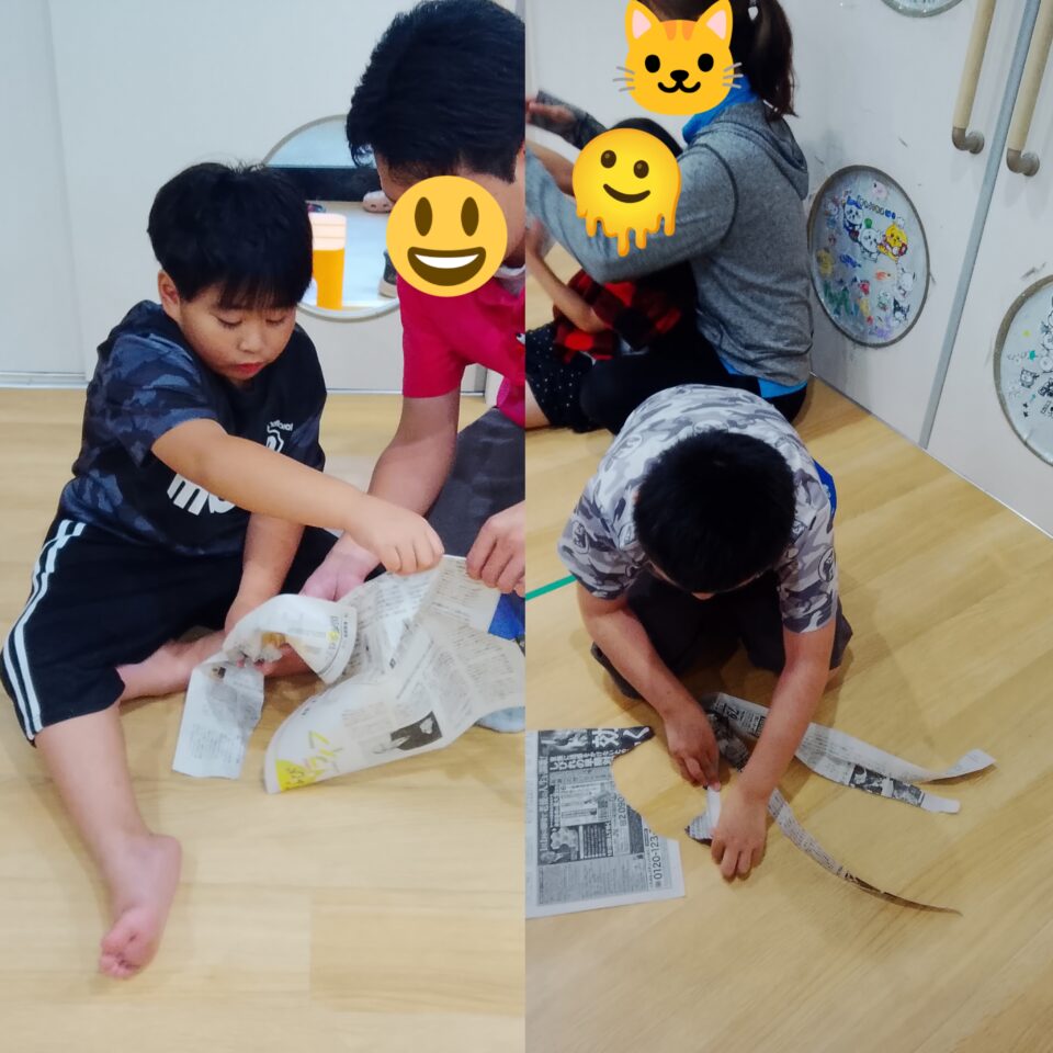 1人1枚新聞紙をもらい、ひたすら長くなるようにちぎります☆