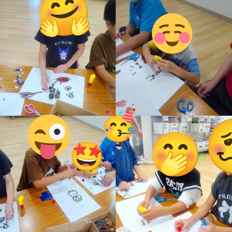 公園で拾ってきたドングリや木の枝などの自然物を画用紙に貼り付けて