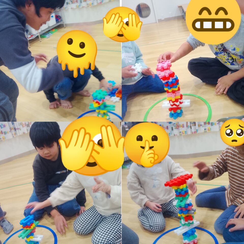 正座した状態で積み重ねたり、中腰で積み重ねたり少しずつルールを変更しながら楽しい活動の時間になったね😊