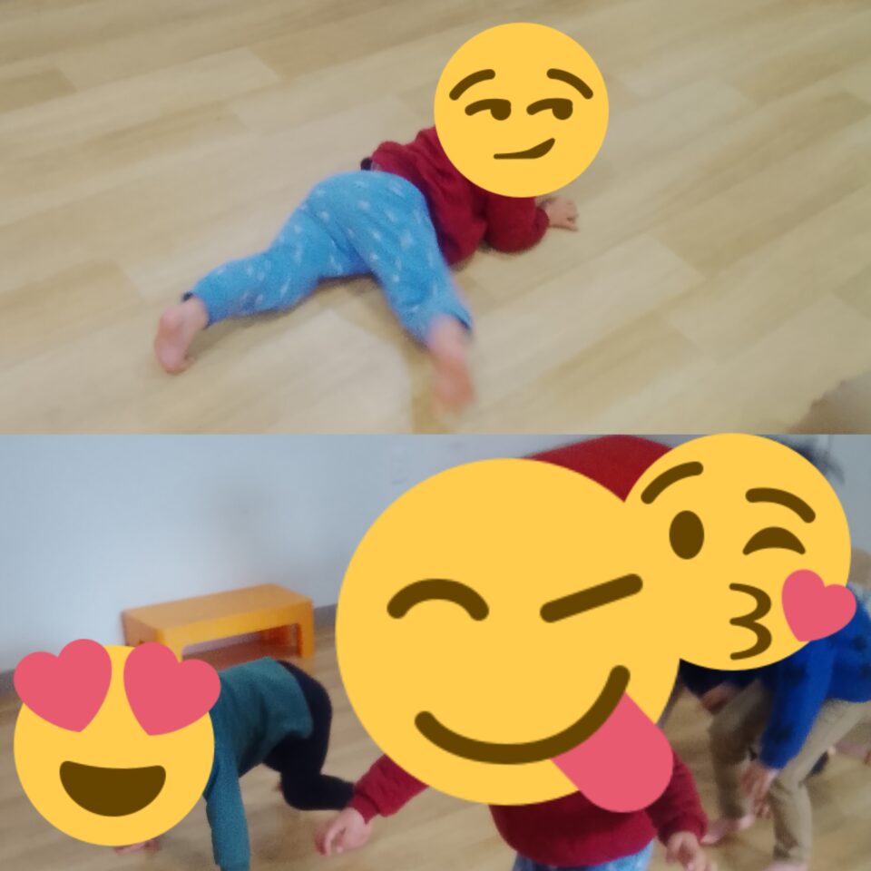 まずは大きなクマさんに変身!膝を地面につかない「高這い」で歩きます。