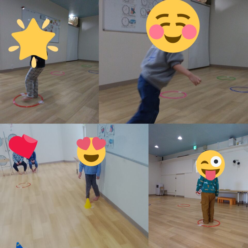 お名前が呼ばれたら輪っかに立って先生が言った色の輪っかをタッチしてスタートの輪っかに戻る!を繰り返ししたね✨