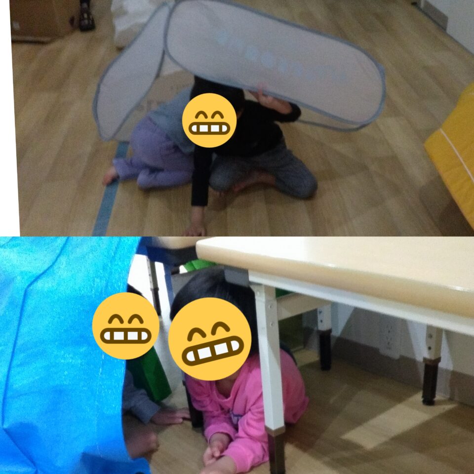 子供たちは、マットの陰に体を小さく丸めて隠れたり、カーテンの裏にそっと忍び込んだり……。 見つかってしまうかな?と、どきどきしながら息をひそめる表情がとっても可愛らしかったです。 鬼のお兄さんたちに見つかった瞬間は、「わあー!」とはじけるような笑顔を見せてくれました✨ 見つかってしまっても、それがまた嬉しくて、何度も何度も繰り返し楽しんでいます。