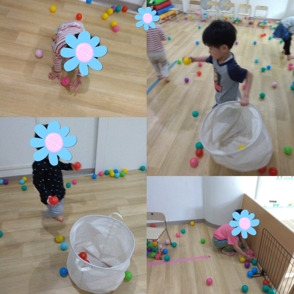 ★ルール:先生が「赤色!」と指定したら、赤いボールだけを探してカゴへ運びます。