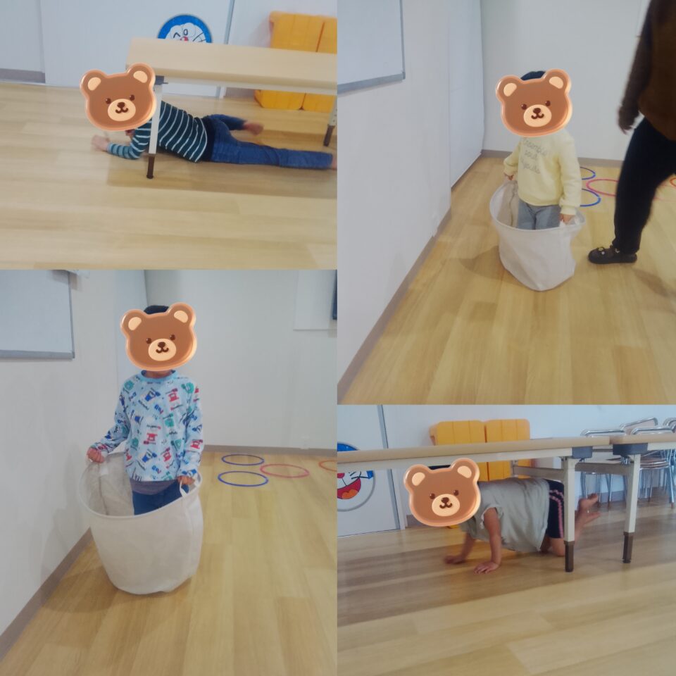 テーブルの下を潜ってね!と声をかけると、みんな体を低くしてスルスルと進んでいきます。