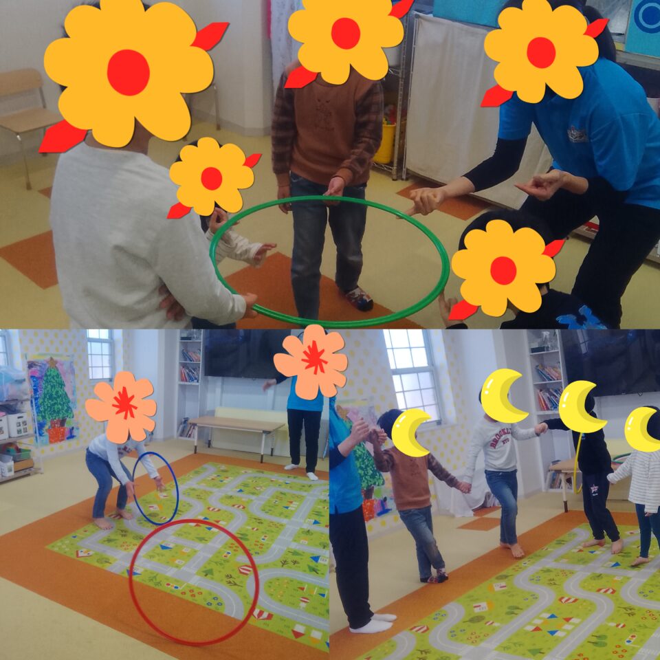 手をつないだまま隣のお友達に渡していったり、向こうの壁までフープの船を渡してたどりついたりと
