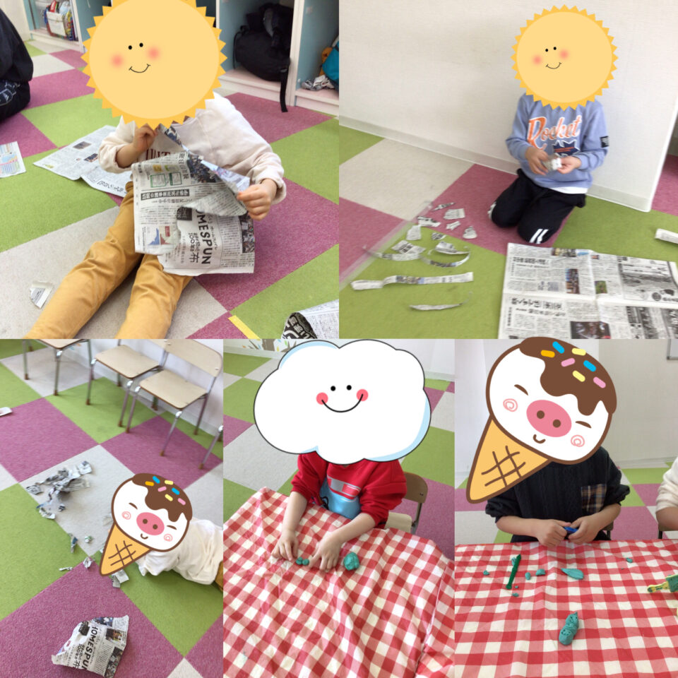 やはり小さいお友だちはどうしても引っ張って破ろうとするところはあったものの、先生と新聞紙を持ちながら、破り方など改めて確認しながら行っています。