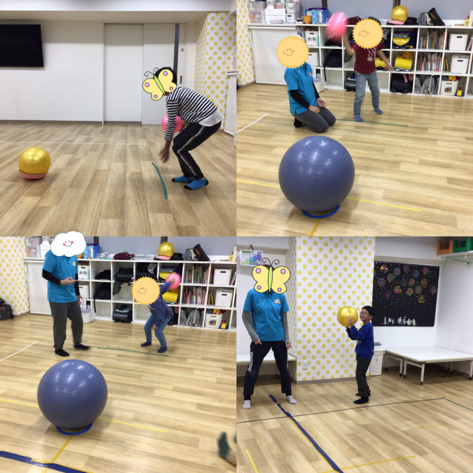 わっかの中にバランスボールを入れて、離れた所からボールを当ててバランスボールを動かせるか?というチャレンジをしました(*^^*)