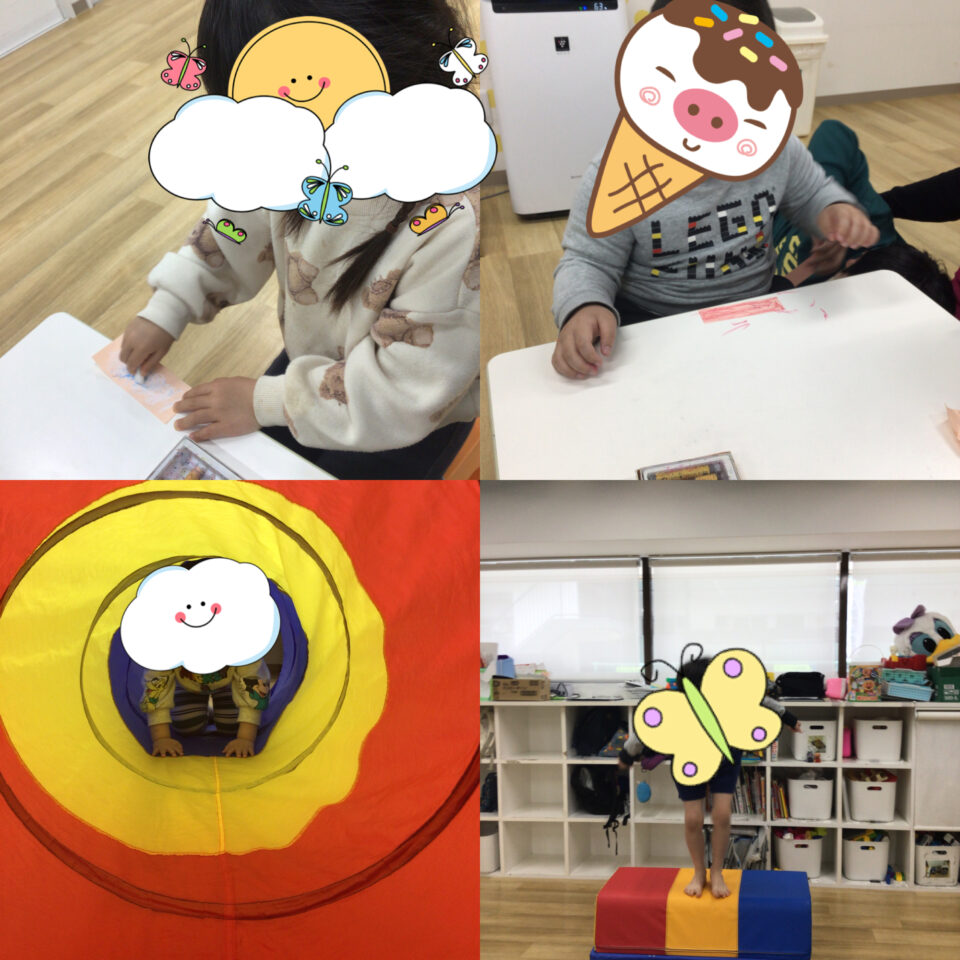 跳び箱を登って降りる、トンネルをくぐる、飛び石を渡る、トランポリンなどを行いました✌