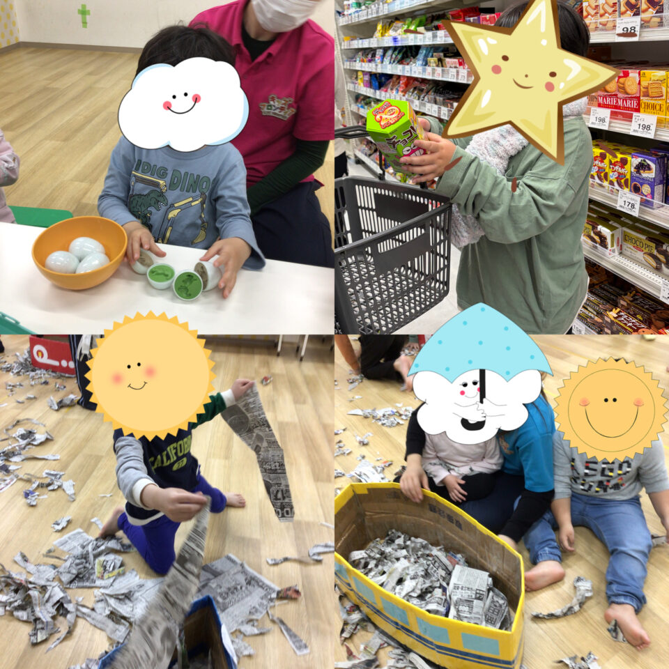 自由遊びでお友だちとプラレールやおままごとで遊んだ後は朝の会をして、午前の活動は『新聞紙ちぎり』を行いました!